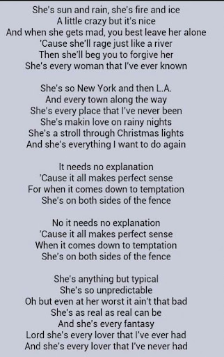 She's sun and rain, she's fire and ice a little crazy but it's nice and when she gets mad, you best leave her alone 'cause she'll rage just like a river then she'll beg you to forgive her she's. Browse for every woman song lyrics by entered search phrase. And every town along the way she's every place that i've never been she's making love on rainy nights she's a stroll.